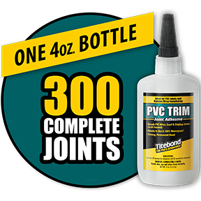 Titebond PVC Trim Joint Adhesive is a single component, high strength adhesive designed for the construction of PVC miter, shiplap & scarf joints along with the installation of column wraps. This solvent-free formulation bonds immediately, forming a complete joint that can be worked with in under 60 seconds. It is 100% waterproof, i...